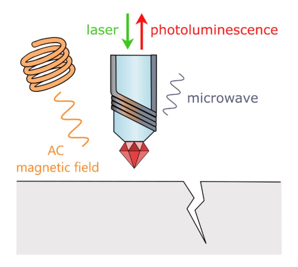 In this case study, we want to illustrate the possible benefits of using Kwan-tek’s quantum NDT solutions for detecting microcracks. An interesting feature of NV diamond sensors is their ability to detect simultaneously AC and DC magnetic fields with high sensitivity. A combination of static magnetic field measurements and AC excitation was thus used to detect the microcracks, like schematized in the picture. Eddy currents were excited by an oscillating magnetic field in the vicinity of the NV fibered sensor. By analyzing the red photoluminescence of the NV diamond, we can measure both the static magnetic field (i.e. magnetic flux leakages) and the AC magnetic signature of the material (eddy current signal).