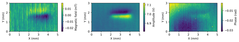 Interestingly, although the sample is made of 304L austenitic steel – supposedly non-magnetic, small fringe fields exist that reveal the crack, which can be detected both with magnetic flux leakage and with the eddy current amplitude and phase signals. The measurement of the magnetic field offered by NV diamonds is also vectorial. The technique inherently provides complementary information, which opens the way not only for detecting defects, but also for identifying and sorting them. This is even reinforced by the quantitative nature of the measurement. For example, two defects of different depths will lead to proportional signal intensities, helping to sort critical microcracks from insignificant ones.